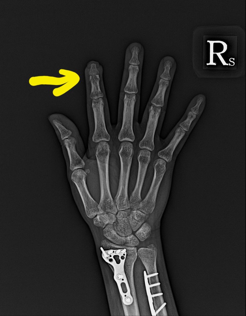 종결 후 2달 되었는데 검지손가락 첫째마디관절통증이 생겨 진단받으니 절단충격으로 첫째마디관절이 좁아져서 외상성관절통이 생겼다고 합니다.