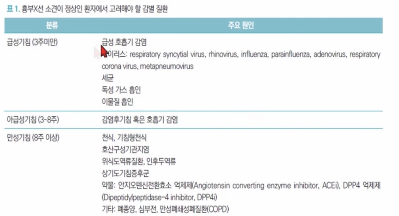 만약 x-ray상 이상소견이 없다면 아래 표에서 볼 수 있는 천식, 호산구기관지염, 역류성식도염, 상기도기침 증후군, 후비루증후군 같은 원인들에 대한 검사가 필요하겠습니다.
