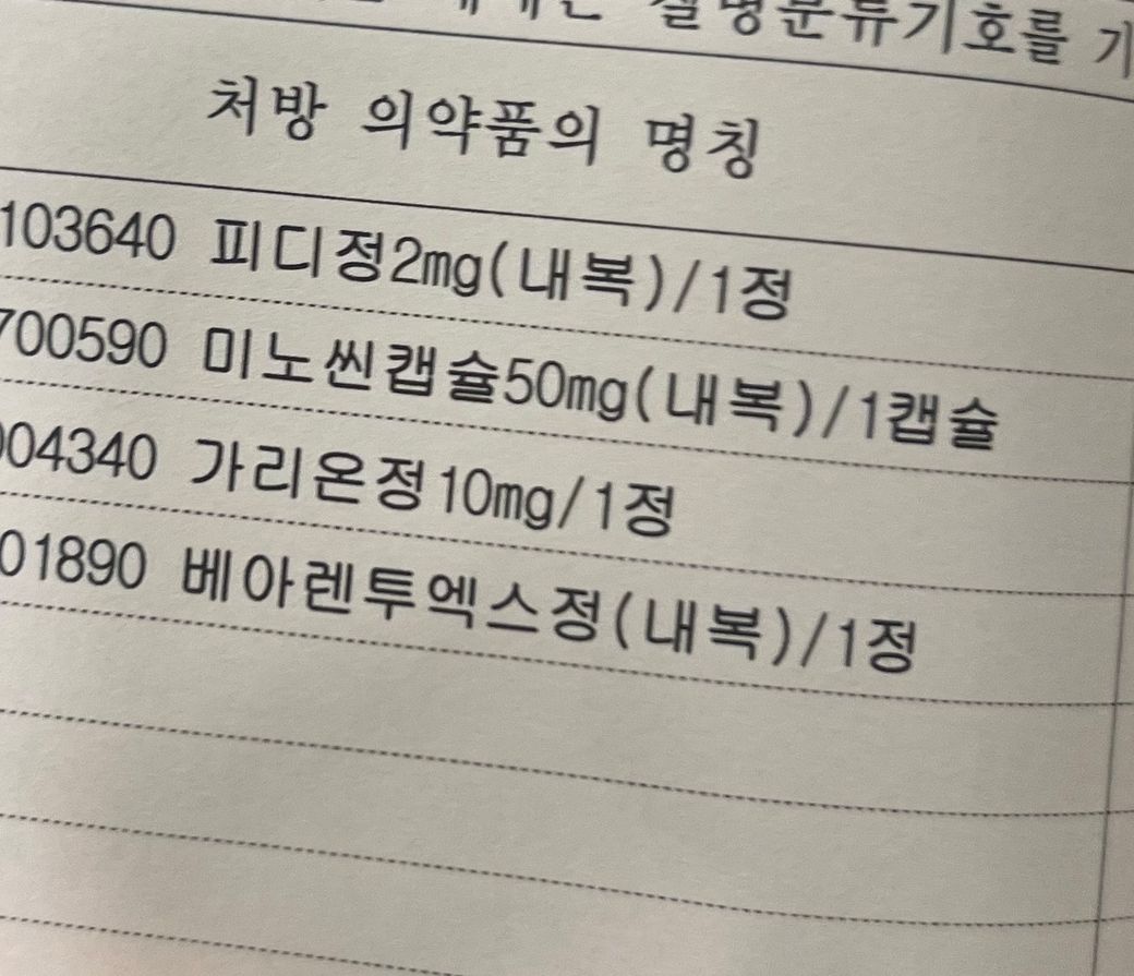 피부과에서 처방받으신 4가지 약들인 피디정, 미노씬캡슐, 가리온정, 베아렌투엑스정을 복용하시면서 추가로 이지엔6이브는 같이 드실 수 있습니다