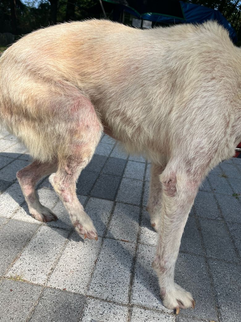 제가 키우는 강아지는 아니고 밖에서 키우는 강아진데 ㅜㅜ 관리가 잘 안되는지 피부병이 생긴 것 같아요. 털도 다 빠지고 엄청 긁고 붉어졌어요.. 아끼는 강아지라 병원이라도 데려가주고싶은데 제 강아지가 아니라 데려갈수가 없는데 상태 좀 봐주세요 ㅜㅜ
