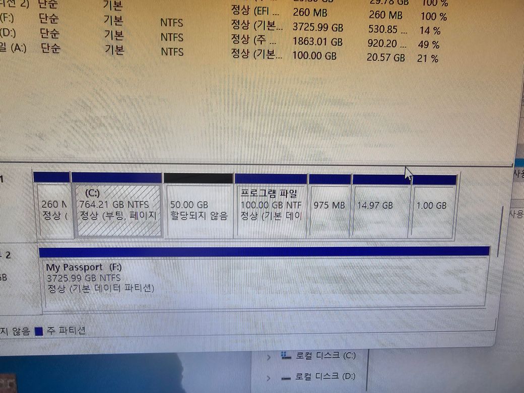 - 확장하려는 파티션(프로그램 파일 파티션)과 인접한 파티션을 삭제합니다.