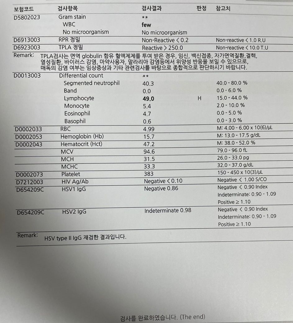 비뇨기과에서 성병 검사를 하고 결과지를 받았는데요. HSV2의 경우 Indeterminate 0.98이라고 나오는데 이게 확실히 음성인지 양성인지 애매한 단계라고 하더라고요. 안심해도 되는 건가요? 아니면 다른 진료가 더 필요한가요?