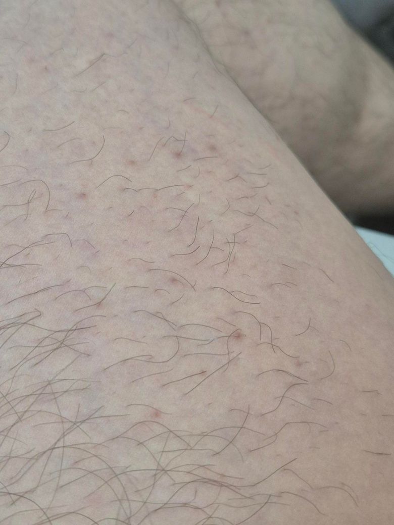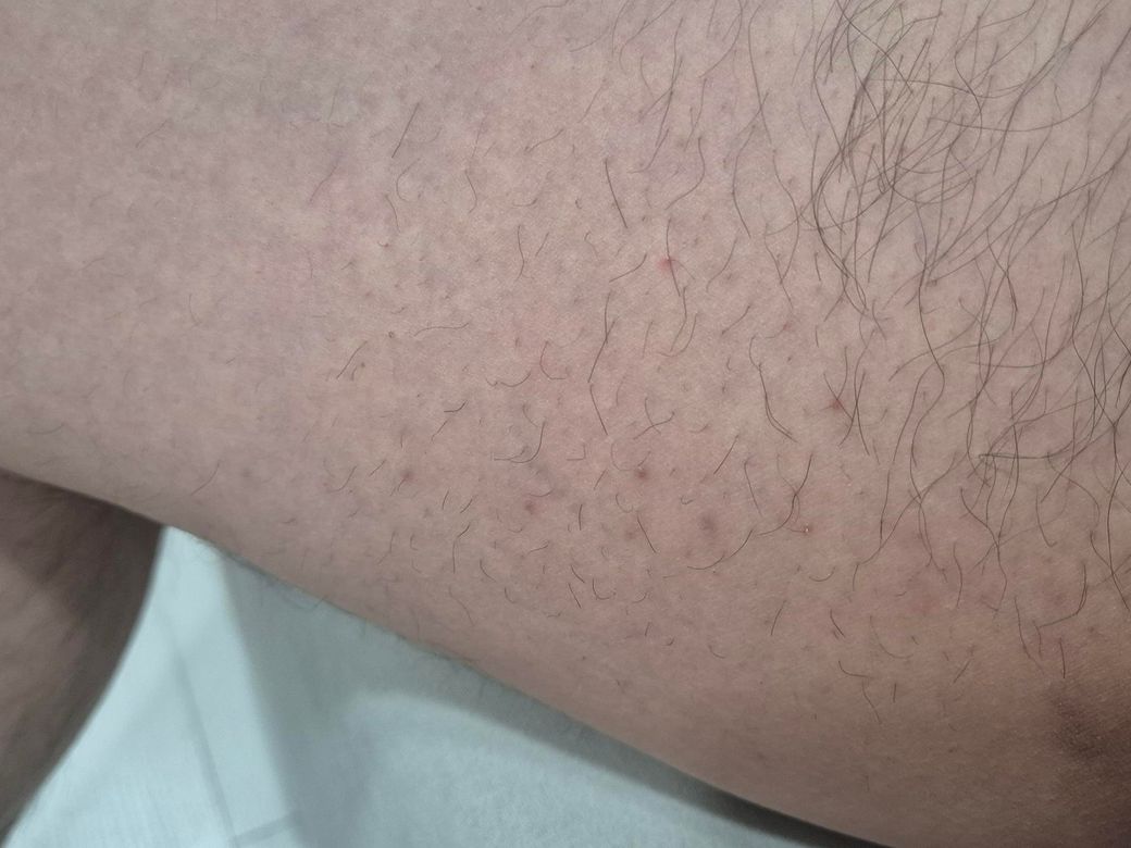 모낭 주위에 작은 발진이 다발성으로 관찰되고 있어 초기 모낭염과 같은 국소 염증성 병변 가능성이 높습니다. 이러한 병변은 증상이 없을 경우에는 별다른 치료 없이 호전되는 경우가 많아 경과 관찰이 가능합니다. 하지만 통증 등의 증상이 발생하거나 농포의 형태로 변한다면 진료를 보시는 것을 권해드립니다.