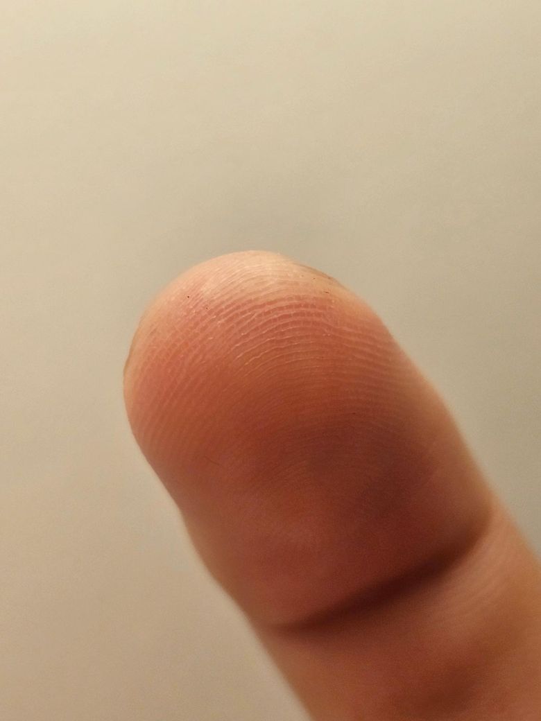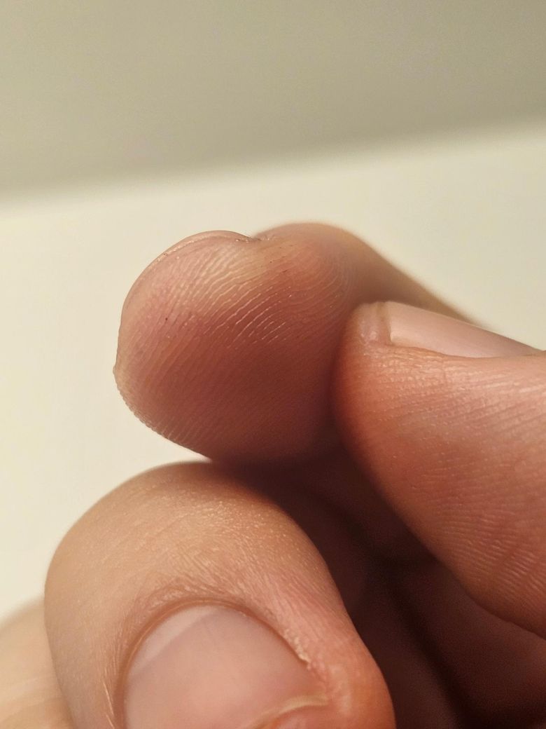 하얗게 된 부분은 굳은살과 비슷한 질감이며 미세하게 튀어나왔습니다. 누르면 살짝 따끔하게 아픕니다.