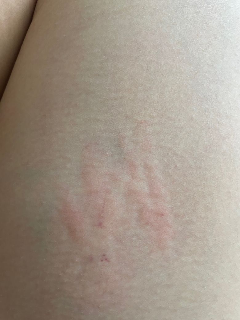 사진의 소견을 통해서 정확하게 상태 평가를 하기는 어렵지만 알러지성 두드러기 또는 접촉성 피부염이 의심스런 소견입니다. 피부묘기증 증상도 의심이 가능합니다. 우선은 항히스타민제를 통해서 증상을 완화시켜보는 것이 필요해 보입니다. 피부과 진료 및 처방을 받으시길 권고드립니다.