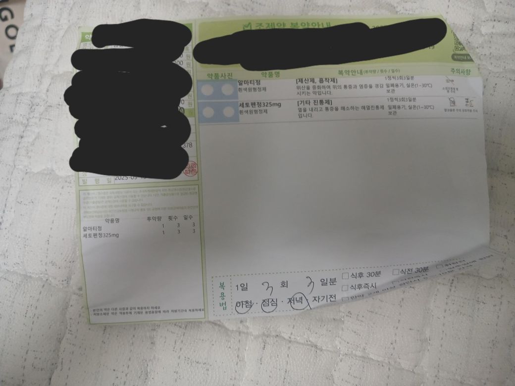 맨 왼쪽부터해서 4번째 사진 약 병원에서 처방 받은 약 봉투에 담긴 초록색 약 봉투인 알마티정 약 잇는 이 약에 진통제가 조금 들어가 잇길래