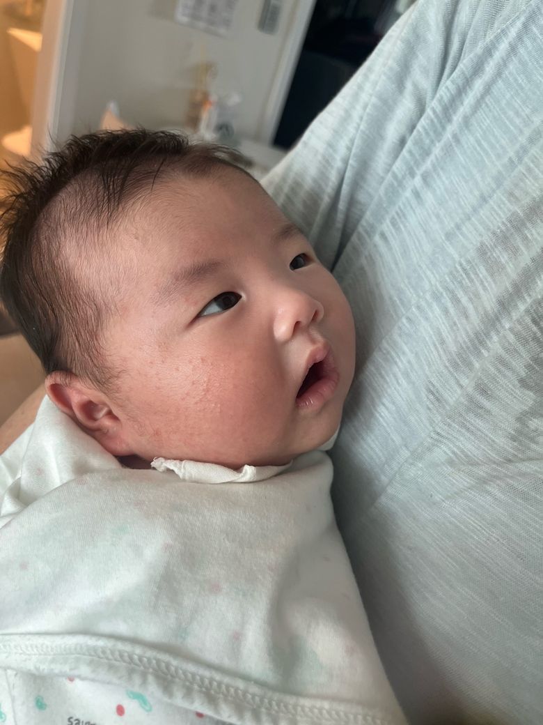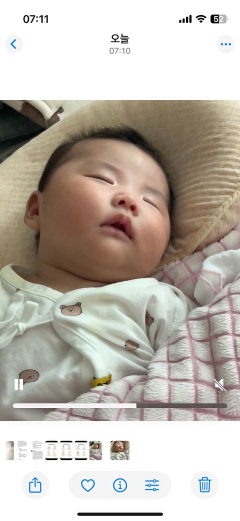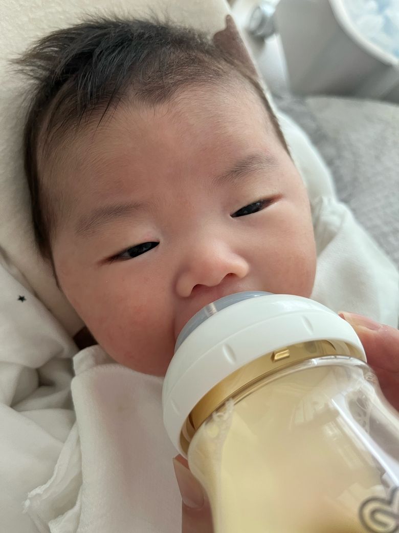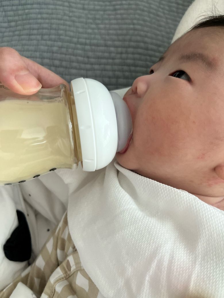 사진상으로 보았을 때 아기의 입 크기 자체가 작은 편은 아니며 젖꼭지를 물 때 입이 크게 벌어지는 능력도 있는 것으로 보입니다. 다만 와이드 젖꼭지 사용 사진에서는 윗입술이 안쪽으로 말리는 모습이 반복적으로 보이고, 젖꼭지 기저부(유두 아래 넓은 부분)가 입 안 깊이 들어가기보다는 입술 경계에서 걸리는 형태에 가깝습니다. 이런 경우 밀착이 충분하지 않아 수유 중 공기 유입이 증가할 수 있고, 그 결과 복부 가스, 잦은 트림, 수유 후 역류나 코로 분유가 나오는 현상이 동반될 수 있습니다.