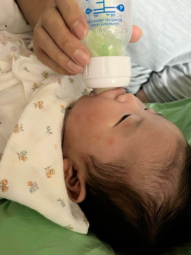 또 한 가지는 하악이 약간 후퇴된 아기에서는 젖병 각도를 조금 더 세워서 젖꼭지가 항상 분유로 채워지게 하는 것이 공기 유입 감소에 도움이 됩니다. 수유 중간 트림을 1회 이상 시행하는 것도 도움이 됩니다.