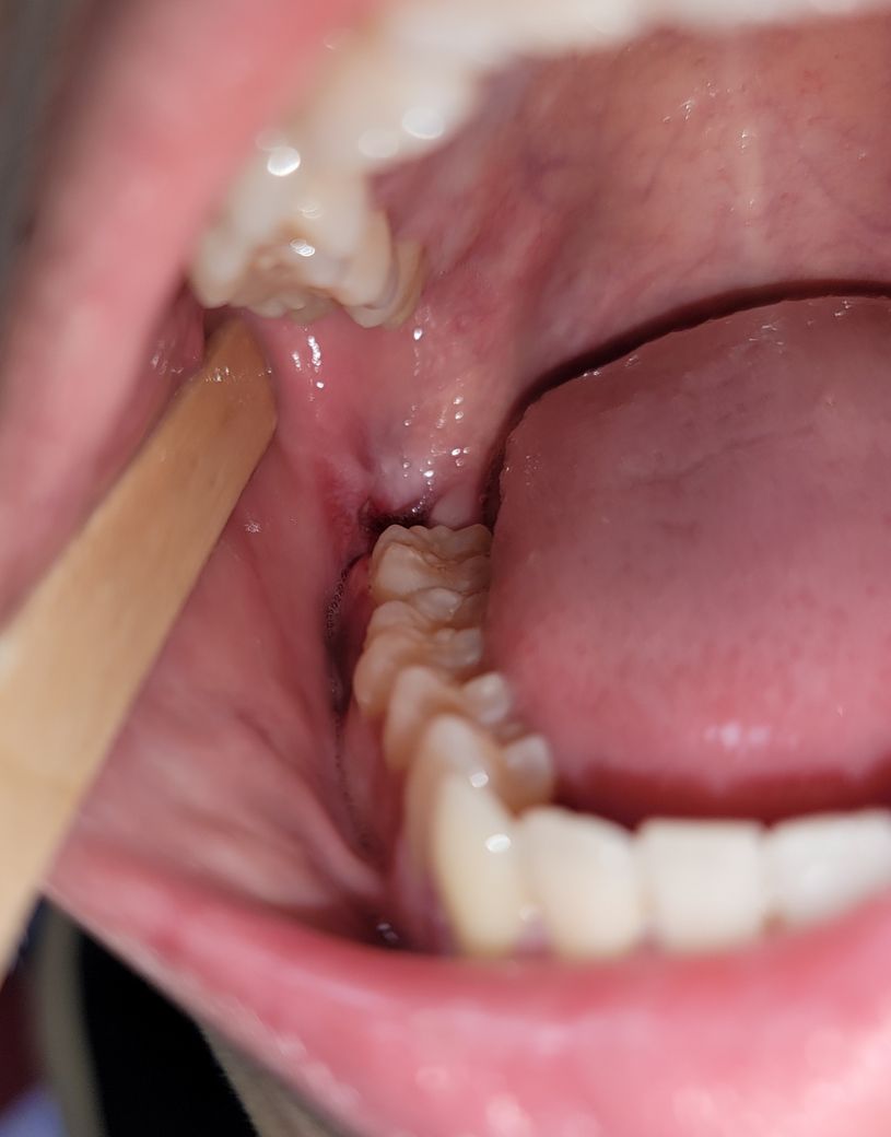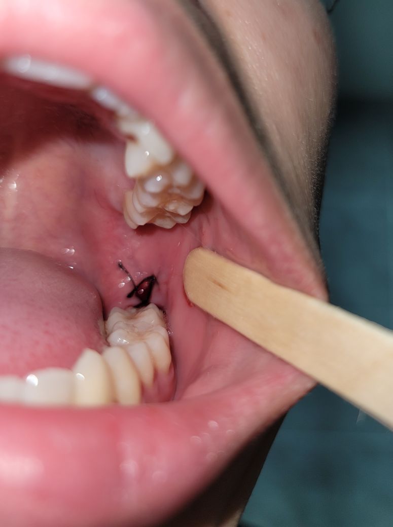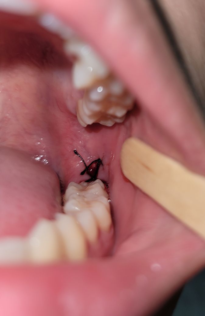실밥을 한번만 묶었는데 좀 느슨한 느낌이 있고 묶은곳에서 조금 위쪽에는 안 묶인 느낌이라 양 옆으로 절개된 잇몸이 서로 맞닫지 않아 각자 상처가 치유되는 느낌입니다.