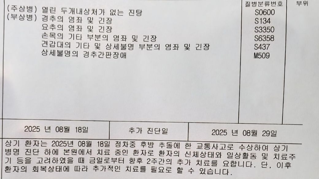 8월18일 사고나서 4일입원하고 아래코드를 받았고