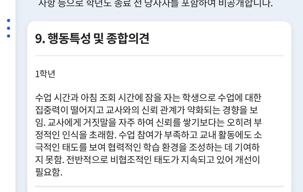 안녕하세요 고등학교 2학년 올라가는 학생입니다. 3.1일 어제 나이스에서 생기부를 열람할수 있게되어 행동 특성및 종합의견을 보게 되었습니다. 교과세특은 담임선생님이 미리 보여주시고 수정할 내용을 받고 행특은 보여주지 않으셨습니다. 행특을 읽어보니 사실이 아닌 내용과 과장된 내용이 포함되어 있는 생기부입니다. 생기부 기재 규정에 위반되는 사항과 정정 방법을 알려주시면 감사할 것 같습니다. 생기부는 미래를 바꾼다는데 이건 아닌것 같습니다