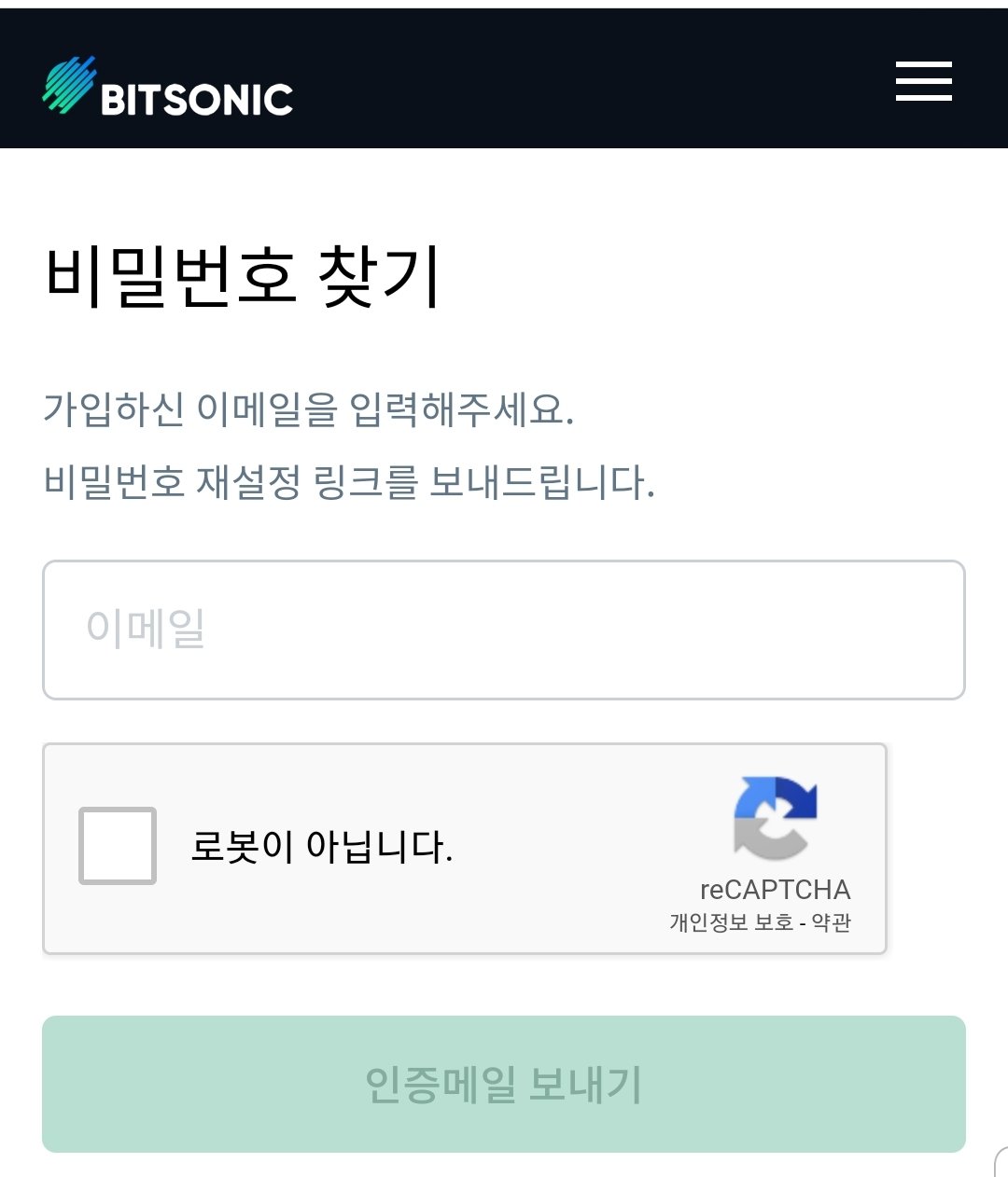 비트소닉거래소 메인화면에 보시면 비밀번호 찾기가 있습니다.비밀번호 찾기를 누르면 아래화면이 나오는데 이메일주소를 입력하여 인증메일을 보내서 확인해보세요.