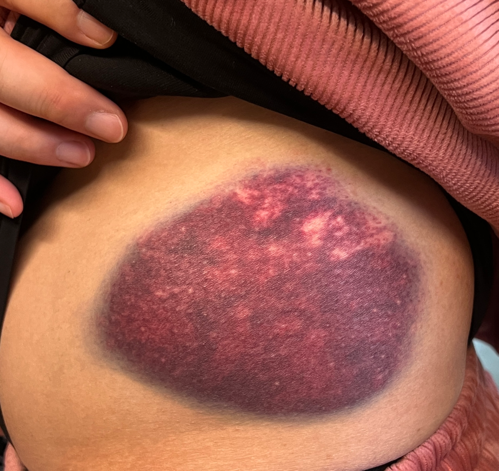 현재 병변상으로는 상당히 큰 타박상으로 보이며, 실제 상처 크기가 많이 크고 내부 장기에도 손상이 있을 가능성이 높아 보이므로 가급적 빠른 시간내로 가까운 병원에 가셔서 영상검사 등을 진행해 보실 것을 권유드립니다.