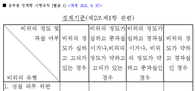 제2조(징계 또는 징계부가금의 기준) ① 징계위원회는 징계 또는 「국가공무원법」 제78조의2에 따른 징계부가금(이하 “징계부가금”이라 한다) 혐의자의 비위(非違)의 유형, 비위의 정도 및 과실의 경중과 혐의 당시 직급, 비위행위가 공직 내외에 미치는 영향, 수사 중 공무원 신분을 감추거나 속인 정황, 평소 행실, 공적(功績), 뉘우치는 정도, 규제개혁 및 국정과제 등 관련 업무 처리의 적극성 또는 그 밖의 정상 등을 고려하여 별표 1의 징계기준, 별표 1의2의 초과근무수당 및 여비 부당수령 징계기준, 별표 1의3의 청렴의 의무 위반 징계기준, 별표 1의4의 성 관련 비위 징계기준, 별표 1의5의 음주운전 징계기준 및 별표 1의6의 징계부가금 부과기준에 따라 징계 또는 징계부가금(이하 “징계등”이라 한다) 사건을 의결해야 한다. <개정 2010. 8. 2., 2011. 11. 1., 2014. 9. 2., 2015. 12. 29., 2018. 5. 30., 2020. 7. 28., 2020. 12. 31., 2021. 8. 27.>