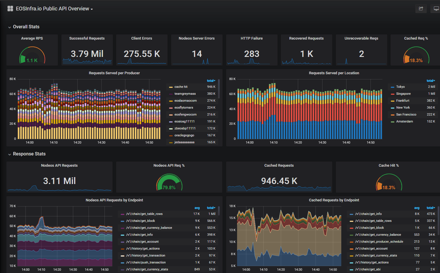 위 그림은 EOS Node Tool 사이트 내에 연결되어 있는 링크 https://proxy.eosnode.network/d/a/eosinfra-io-public-api-overview?orgId=1 를 통해 확인한 현재 이오스 노드 인프라 정보입니다.