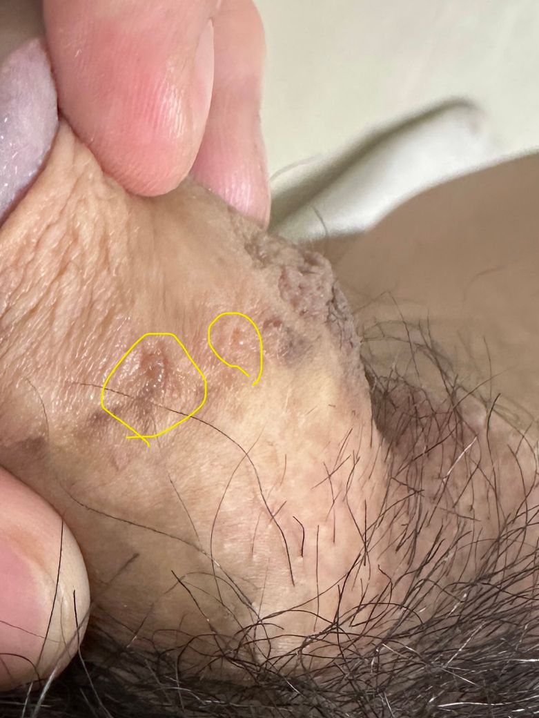 두 번째로 모낭염(Folliculitis)입니다. 성기 옆 사진에서 보이는 작은 동그란 구진은 털이 나는 부위 주변에 위치해 있고, 형태적으로 모낭 주위 염증과 잘 맞습니다. 면도나 피부 마찰 후 흔히 생깁니다.