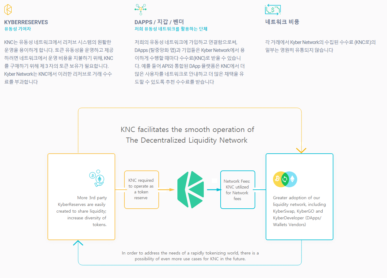카이버 네트워크는 서로 다른 블록체인을 연결하여 거래할 수 있도록 도와주는 시스템입니다. 카이버네트워크를 통해 토큰 변환을 할 때 "카이버네트워크(KNC)" 토큰을 사용하게 됩니다. 즉, 카이버네트워크 토큰이 실시간적으로 환율을 반영하여 중계역할을 하므로써 토큰간 직교환이 이루어지는 역할을 하게되며 이때 수수료 지불로 카이버 네트워크 토큰이 사용되기도합니다.