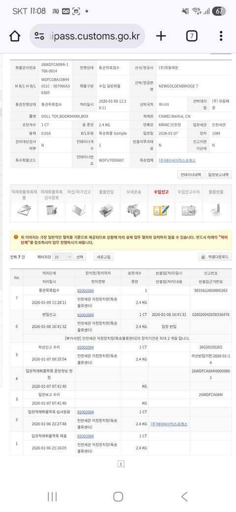 현재 상황으로 봤을 때 통관 목록 접수가 이미 이루어진 상황이 고 큰 문제가 없다면 조만간 통관이 완료 되지 않을까 싶습니다
