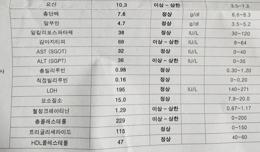 간 수치가 애매하게 살짝 높고, 콩팥 기능 수치가 정상 범위보다 높습니다. 또한 지질 수치들이 높습니다. 관련하여서는 체중 조절을 해주어서 지질 수치들을 개선을 해보고 금주 및 식단 조절을 통해서 간 수치를 개선해보는 것이 좋겠습니다. 콩팥 수치가 좋지 않은 것은 직접적으로 진료를 받아보시는 것이 좋겠습니다. 종합적으로 내과 진료를 받아보는 것이 아무래도 필요할 것으로 사료됩니다.