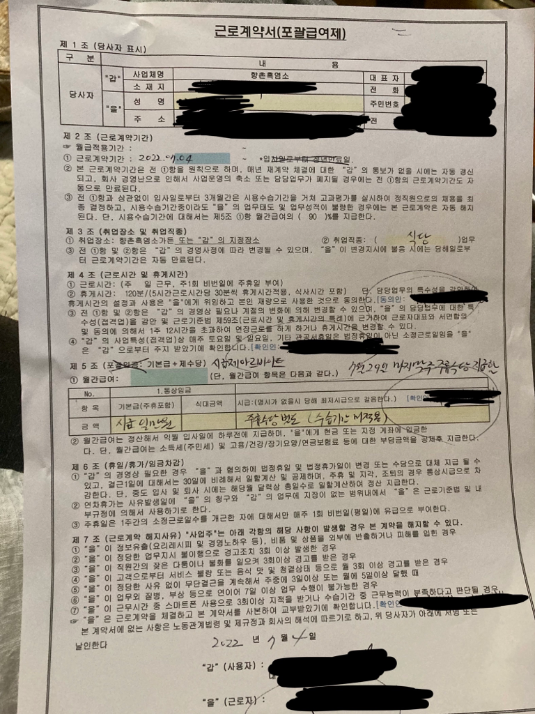 제 나름대로 수정한다고 수정했으나, 집에 돌아온 뒤 다시 계약서를 보니 소정근로일과 근무일이 기재되어있지 않더라고요. 그리고 날짜도 계약서 작성일(8/1)이 아닌 7/4로 되어있으며 사용자 성명란에도 제가 알고있는 사장님 성함이 아닌 다른 분의 성함이 적혀있습니다.