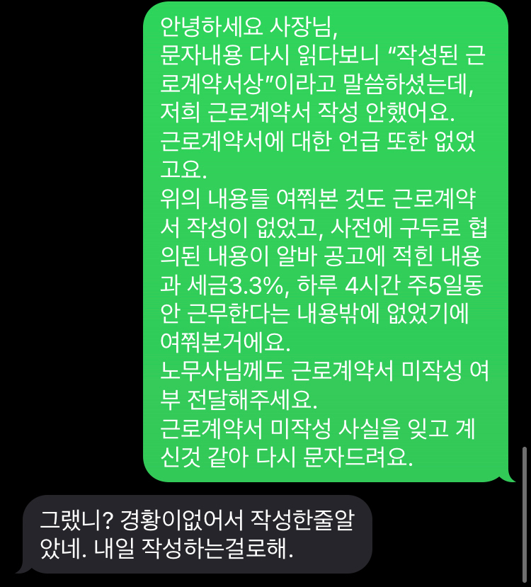8/1 사장님께서 계약서를 작성하며 이야기하자고 하셔서 가게에 출석하였으나