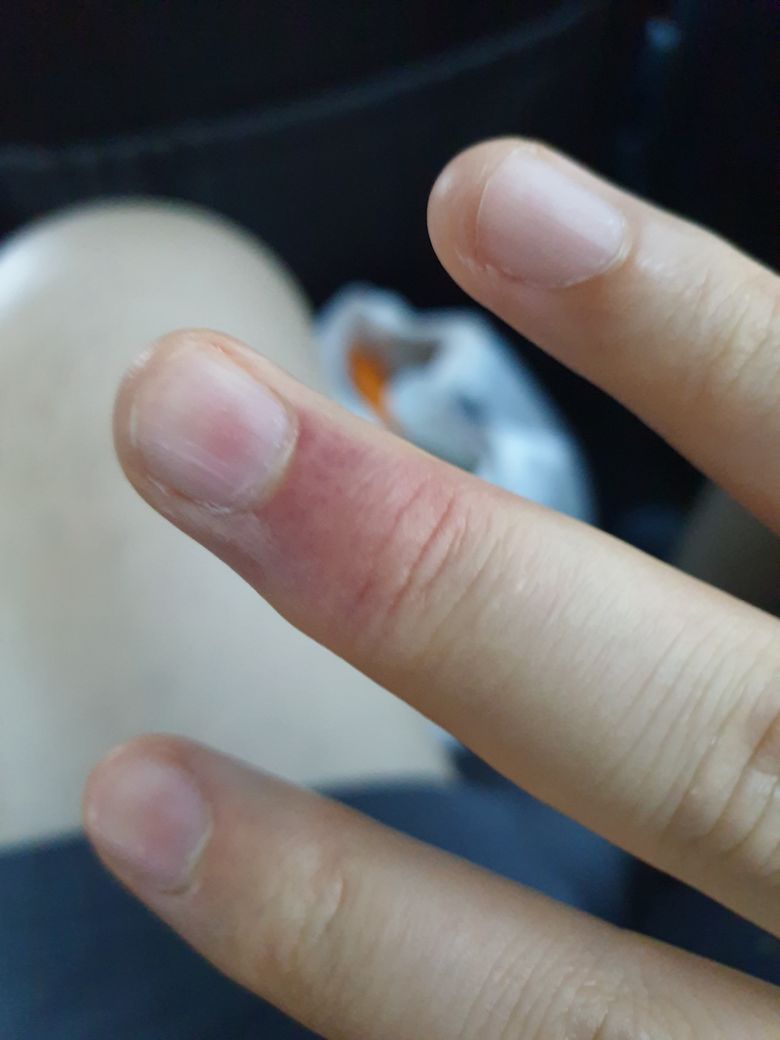 중지 손톱 아래 피부가 빨갛게 되었는데 전에도 이랬더든요? 왜 이런거죠? 간지럽거나 아프지 않아요.