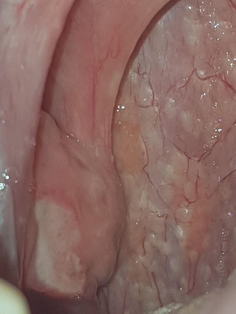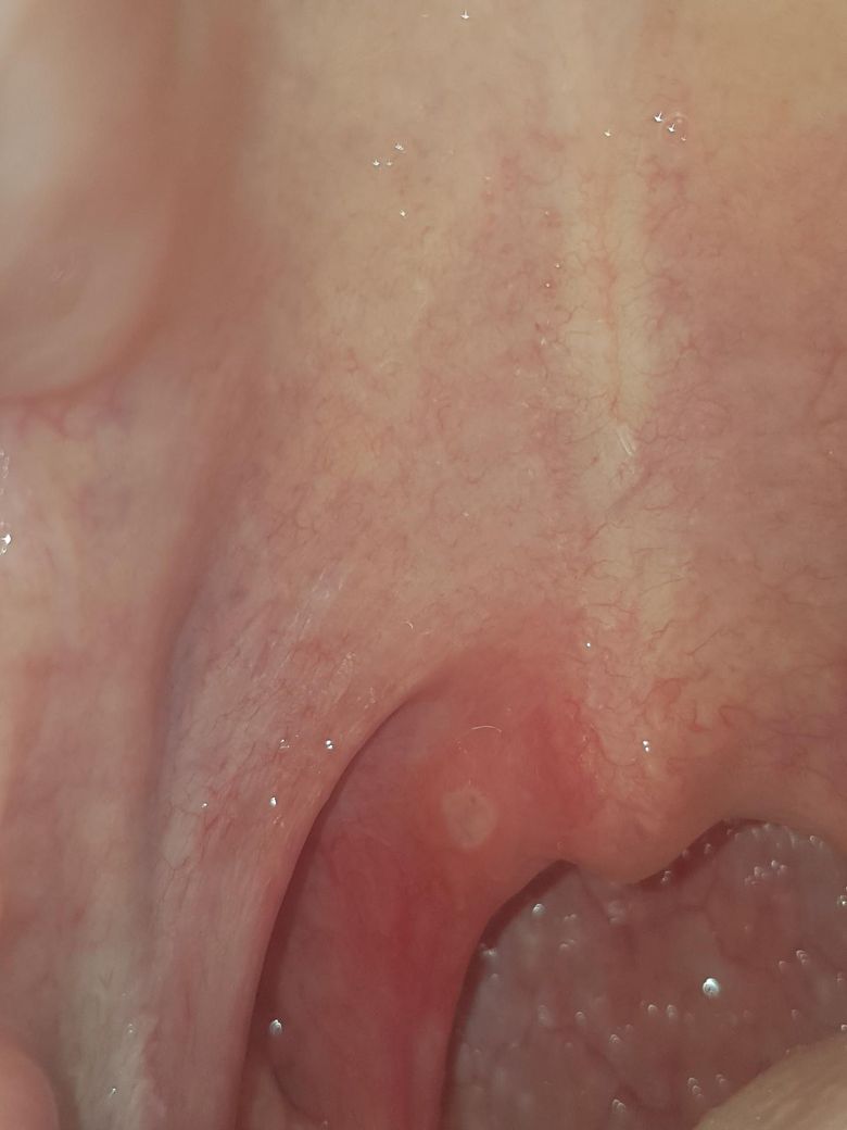 사진을 기준으로 보면, 병변은 인두 측벽에 국한된 흰색의 얕은 궤양 형태이며 주변 점막에 경미한 발적이 동반돼 있습니다. 물집 군집이나 진한 삼출물, 두꺼운 백태는 보이지 않아 급성 세균성 편도염이나 전형적인 헤르페스성 병변의 소견과는 거리가 있습니다. 육안 소견만 놓고 보면 아프타성 궤양 계열에 가장 가깝습니다.