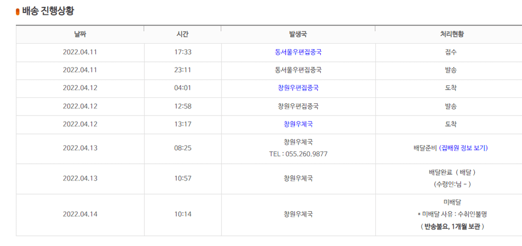 수취인불명이라고 미배달이 떳는데, 아무래도 회사주소로 하여 그런듯 한데.