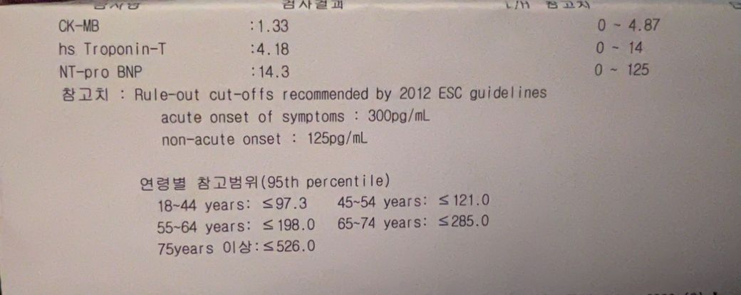 올려주신 피검사 수치(CK-MB 1.33, hs-Troponin-T 4.18, NT-proBNP 14.3)는 모두 정상범위이며, 급성 심근경색이나 심근 손상을 시사하는 소견은 보이지 않습니다. 특히 troponin 수치가 정상이라는 점은 현재 시점에서 심장 원인 가능성을 낮춰줍니다.