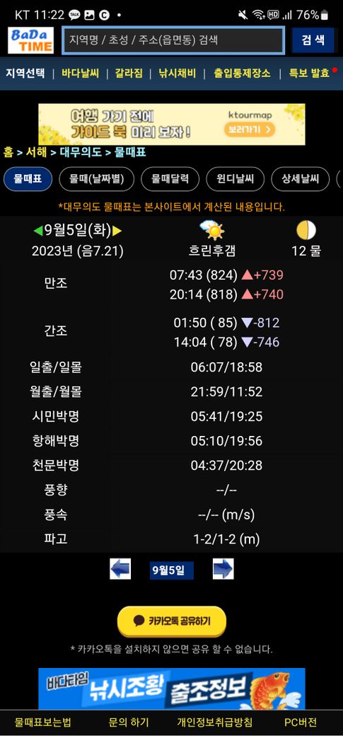 새벽 1시50분과 오후 2시4분이 간조 즉 썰물이 가장 많이 빠져나간 시간 입니다.