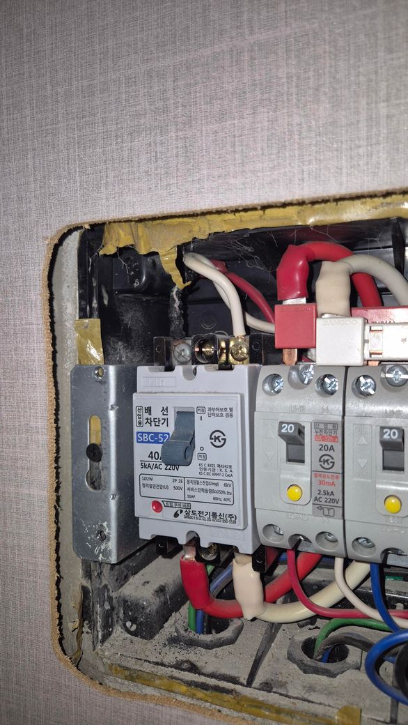 우선 차단지 전면에 40A로 적혀 있는거같고 옆의 기존 차단기들이 20A 인데 20->40으로 바꾸신걸까요