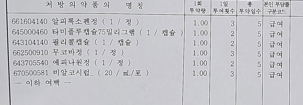 네 처방받으신 약은 전부 다 복용해주세요. 타미플루는 증상이 2~3일 안에 호전되지만 5일은 다 복용하셔야합니다.