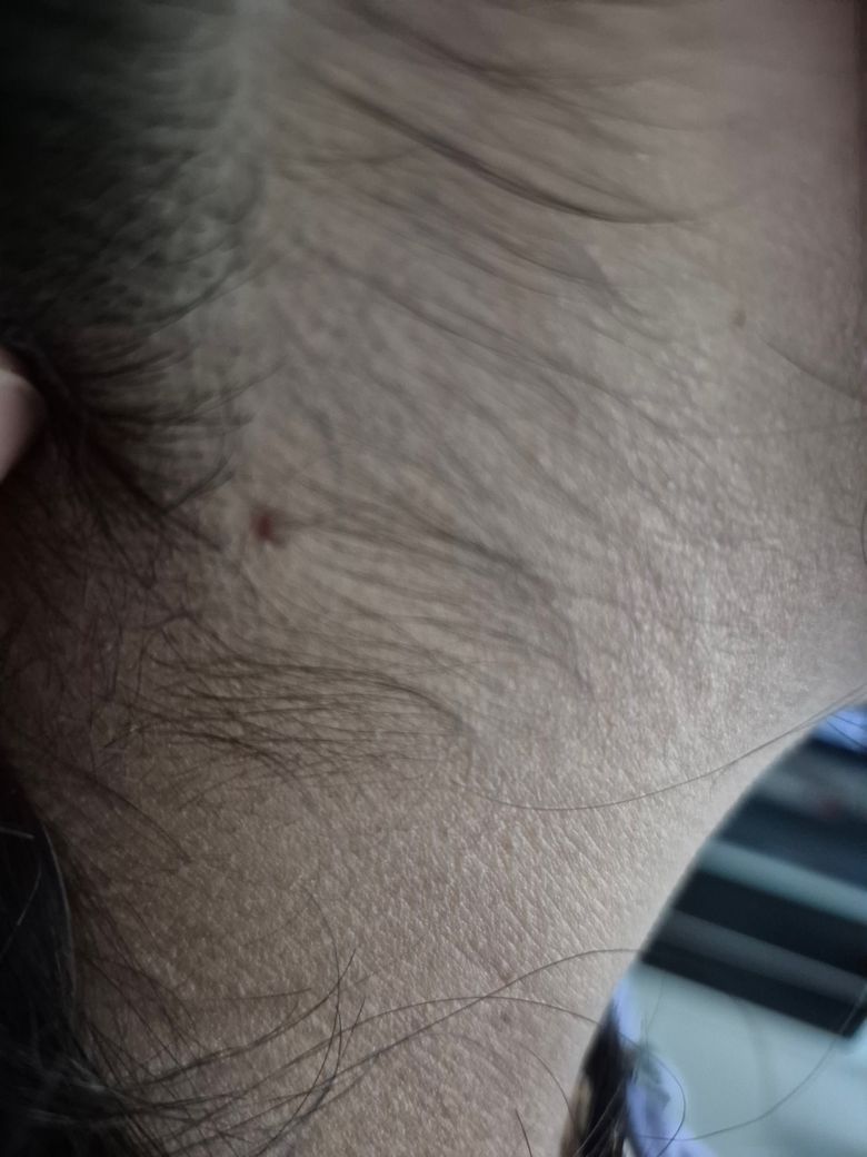 만지면 약간 울퉁불퉁 하구요 뭔가 튀어나온거같아요. 뒷목에 위치해 있고요 잡아 당기면 안늘어나고 색깔은 맨눈으로 보기에는 갈색이고, 매끈매끈 하진 않아요.