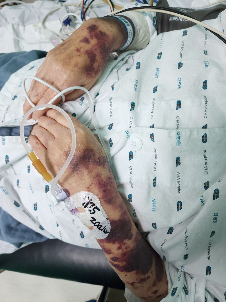 긁히거나 주사바늘이 들어갔다 나온 자리는 어김없이 멍이들고 거동이 힘들어 부축하려 팔다리를 세게 잡아도 멍이들고 피부가 당겨져도 쉽게 갈라져 피가 나네요.