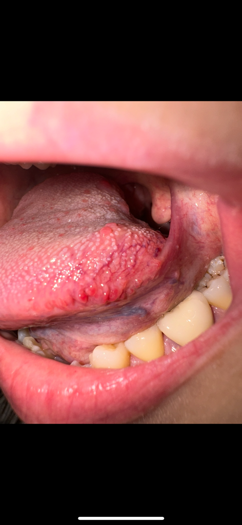 증상으로 봐서는 설염의 가능성이 있어 보이고 검붉은 건 혀 정맥류의 가능성이 있어보입니다