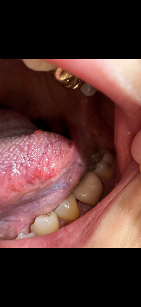 혀 아래쪽에 보이는 파란색은 혀 아래를 지나가는 정맥입니다. 큰 문제가 되는 조직은 아닙니다.