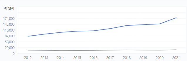 2022년도 기준 중국의 GDP는 18,321,197(백만달러)이며, 인도의 GDP는 3,468,566(백만달러)입니다. 2017년도 당시는 중국은 11,795,297(백만달러), 인도는 2,439,040(백만달러)로 이 차이가 더 크게 벌어진 상태입니다.