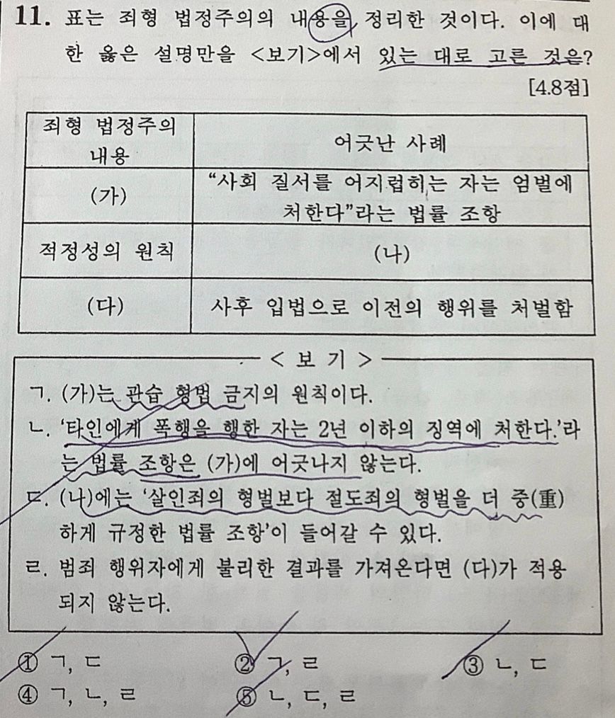 소급효 금지 원칙의 예외로서 신법이 피고에게 유리하게 적용될 경우 원칙을 적용하지 않는 것으로 알고 있습니다. 문제 선지 중 ㄹ '범죄 행위자에게 불리한 결과를 가져온다면’의 의미를