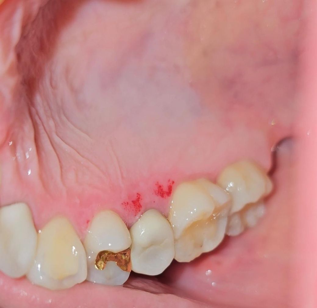 사진으로 보이는 것은 연조직이 손상된 것으로 보입니다 해당 부위에 과도한 힘이나 날카로운 음식 등으로 인해서 잇몸에 상처가 나게 되면 사진과 같이 붉게 보일 수 있습니다.