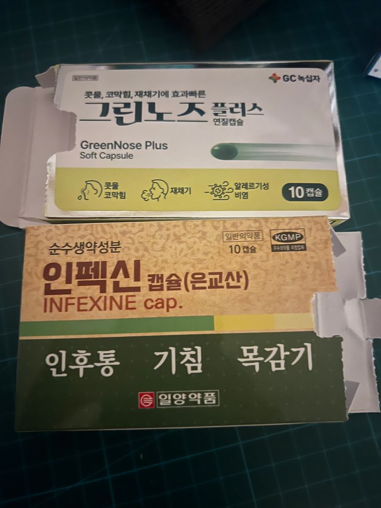 그린노즈가 콧물 코막힘에 효과적인 약물이고, 인펙신이 인후통, 기침 등에 효과적인 약으로 자주 병용해서 복용하는 조합입니다.