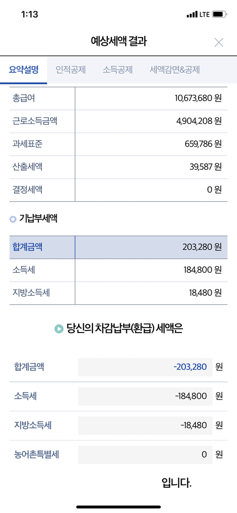내용을 설명해드리면 한 해 동안 발생한 소득에 대한 세금을 결정세액이라고 하는데, 결정세액은 0원이며 기납부세액(원천징수세액)이 203,280원이므로 전액 환급받는 것입니다.