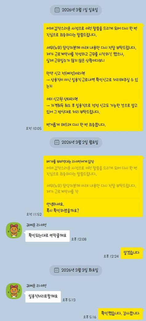 그리고 2~3일의 시간이 흘렀고 3월 3일에 일용직으로 처리를 하겠다는 확답을 받았습니다.
