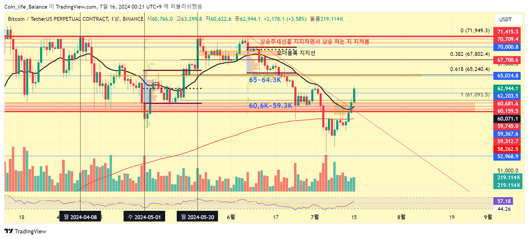 기존의 강한 저항대를 뚫어 준 60.6K를 계속 지지 해주는지가 매우 중요 합니다~
