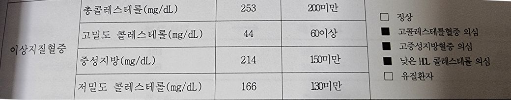중성지방과 LDL수치가 높고 HDL 수치가 낮고 전형적으로 콜레스테롤이 높다고 보여집니다.