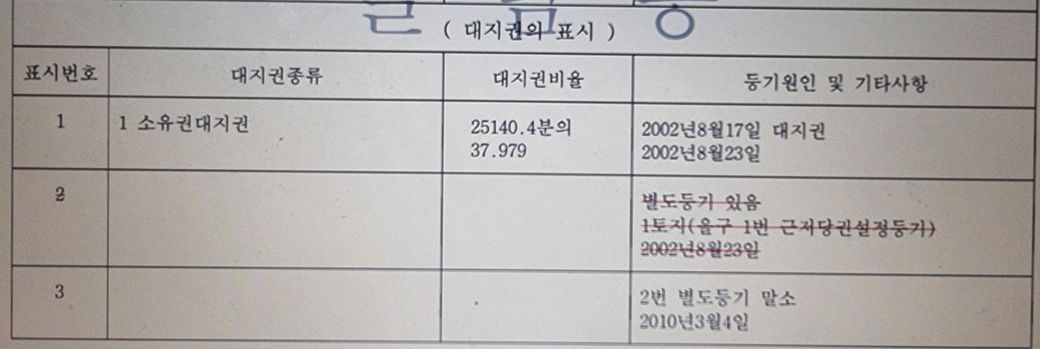 해당 부분은 건물등기부상 권리변동내역이 아닌 말그대로 토지등기부상 변동내역을 기재한 부분이기 때문입니다. 그리고 해당 부분도 사실상의 표제부에 표기되는 부분으로 표제부의 경우 건축물 대한 갑구, 을구상 권리변동에 해당되지 않는 부분으로 등기접수날짜등은 토지등기부상 을구를 통해 확인하셔야 할 부분입니다.