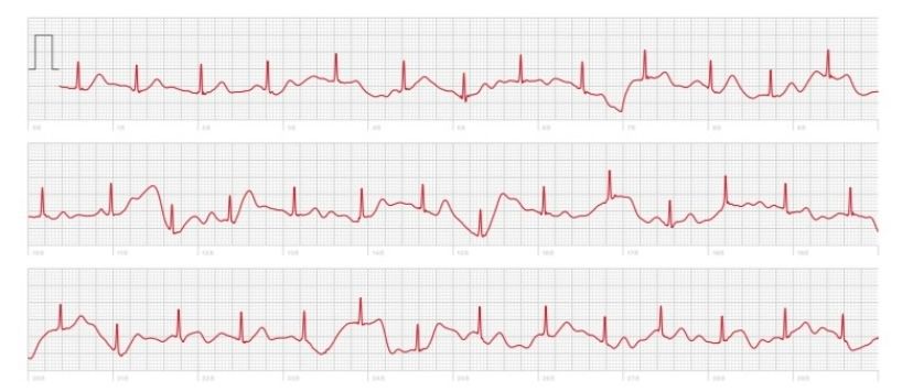 올리신 심전도 소견은 워낙 베이스라인이 위아래로 왔다갔다 하기 때문에 구체적으로 자세하게 평가를 하기 어렵습니다. 또한 스마트 워치의 심전도 소견에 대해서는 의료적으로 구체적으로 특별한 의미를 부여하기는 어렵습니다. 때문에 해당 내용들을 통해서 정확히 문제가 있는지 어떤지 파악할 수 없습니다. 문제가 있는지 여부를 파악하길 희망하신다면 심장 내과적으로 구체적으로 감별 진단을 받아보시는 것이 필요하겠습니다.