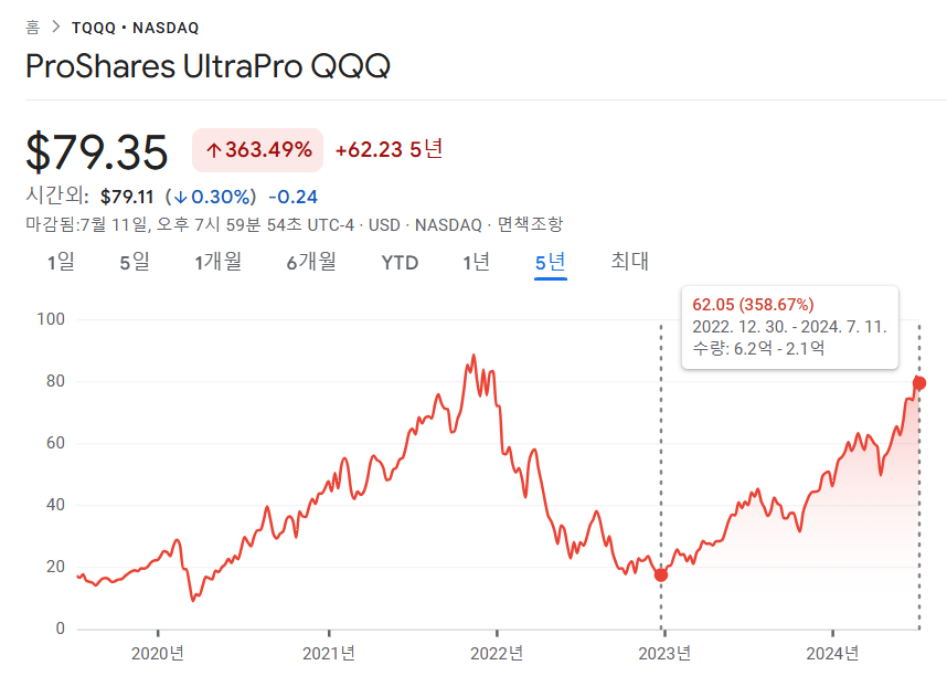 TQQQ는 레버리지 ETF로, 주가의 상승 및 하락에 따라 배수된 수익이나 손실이 발생할 수 있는 상품입니다.