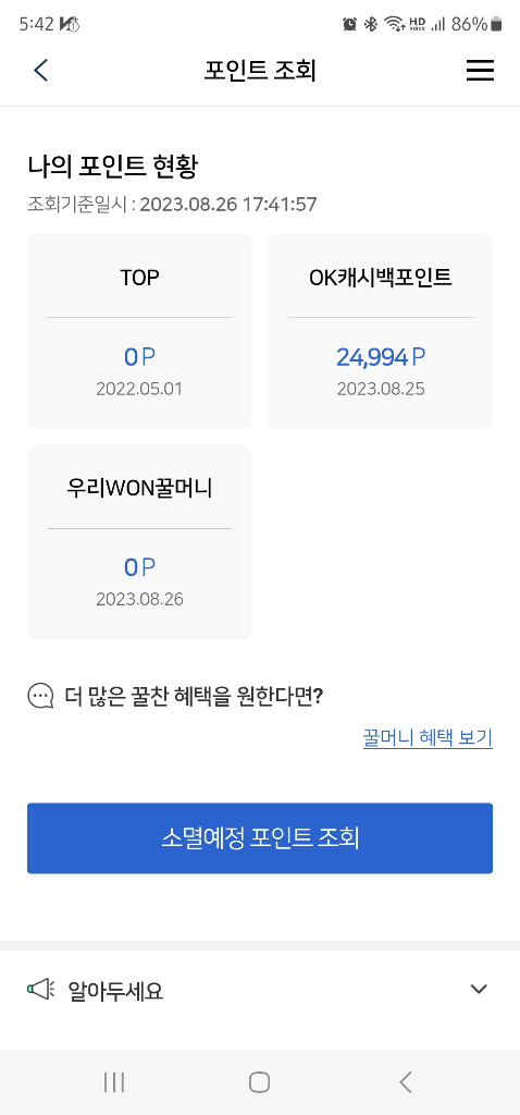 우리카드 사용하고 오케이캐시백이 적립 되었는데 포인트조회하면 위사진처러 조회가 됩니다 그런데 ok캐시백앱에 들어가도 연동도 안되고 우리카드앱에서 전환도 안되고 답답하네요