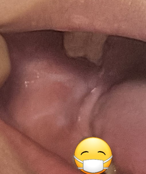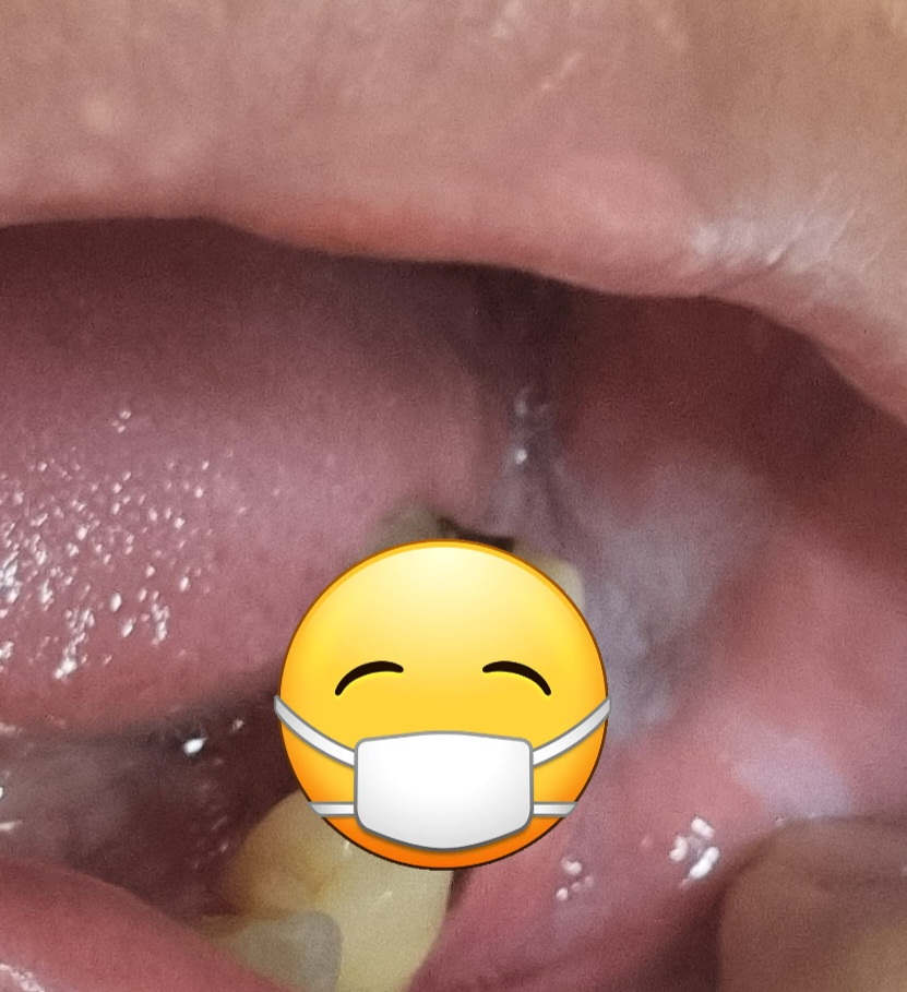 구강점막은 부분적으로 희게 보이는 부분이 있으며, 또한 구강점막 상피 일부가 떨어져 나온 것이