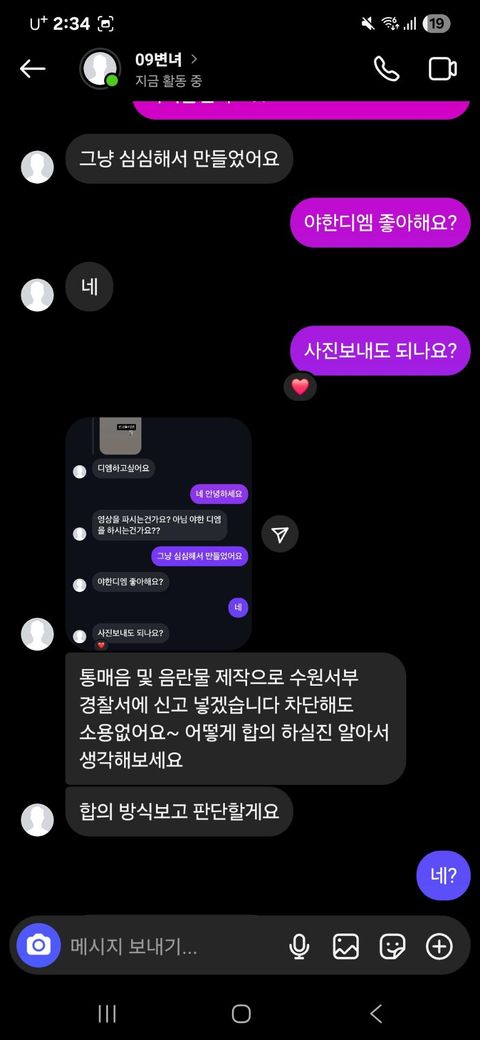 이렇게 해서 성기사진을 보내게 되었는데 합의금 어케 할거냐해서 제가 3만원 어떠냐고 해서 그쪽도 승낙을 했어요. 근데 내일까지 안주면 고소한데요.. 저 처벌받나요ㅠㅠ